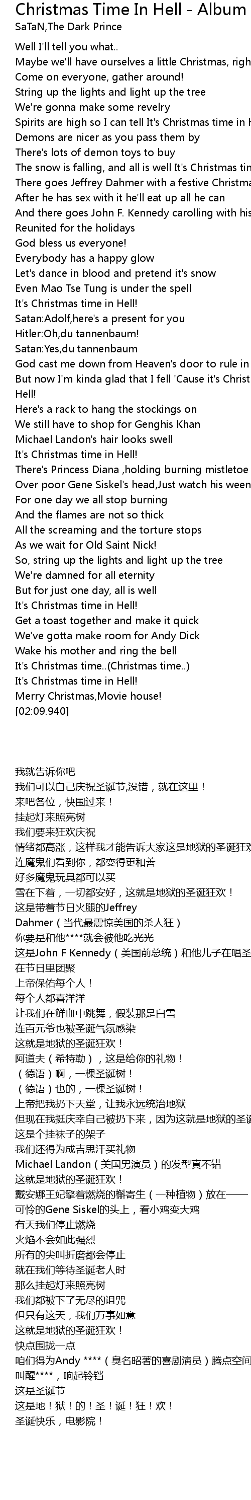 But now I'm kinda glad that I fell 'Cause it's Christmas time in Hell! |