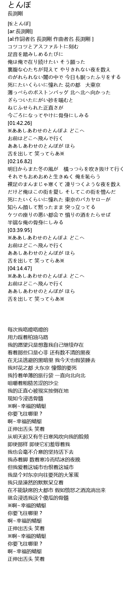| [01:44.87] | ※ああしあわせのとんぼよ どこへ |