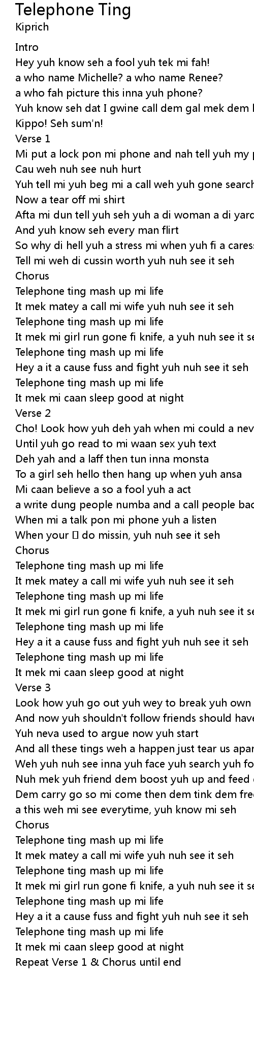 | Yuh tell mi yuh beg mi a call weh yuh gone search di phone fah | |
