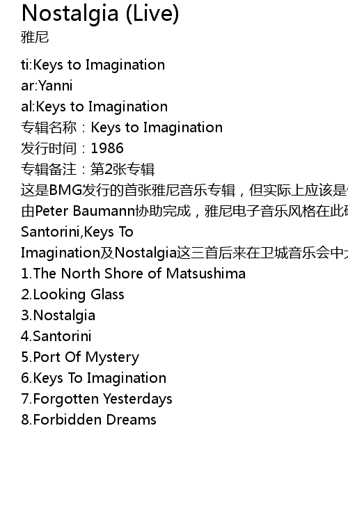 | [03:00.00] | Santorini,Keys To Imagination及Nostalgia这三首后来在卫城音乐会中大放光彩的作品最初均收录于此。 |