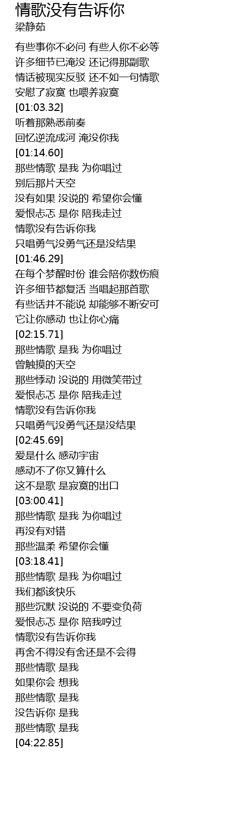 | [01:36.52] | qíng gē méi yǒu gào sù nǐ wǒ |