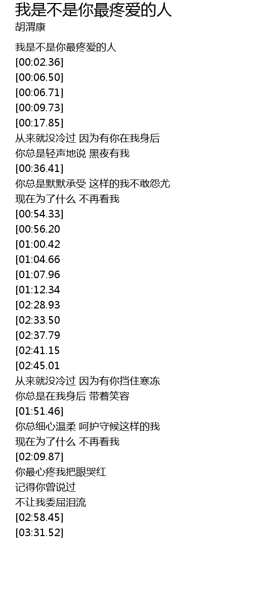 | [03:00.61][02:28.93][01:13.54] | 我是不是你最疼爱的人 |