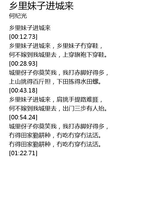| [00:06.45] | 乡里妹子进城来 |
