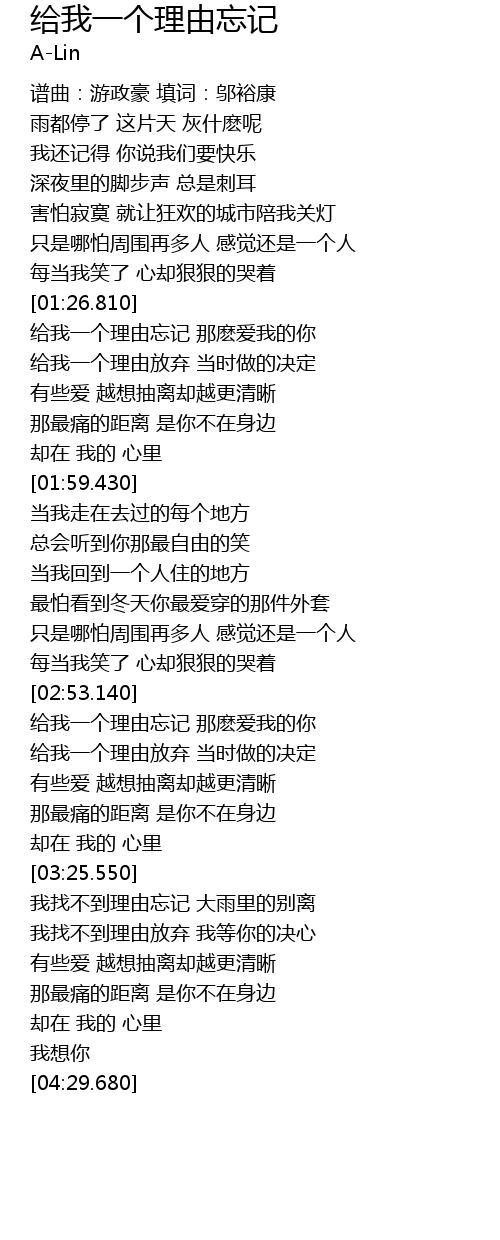 | [02:53.700] | 给我一个理由忘记 那麽爱我的你 |