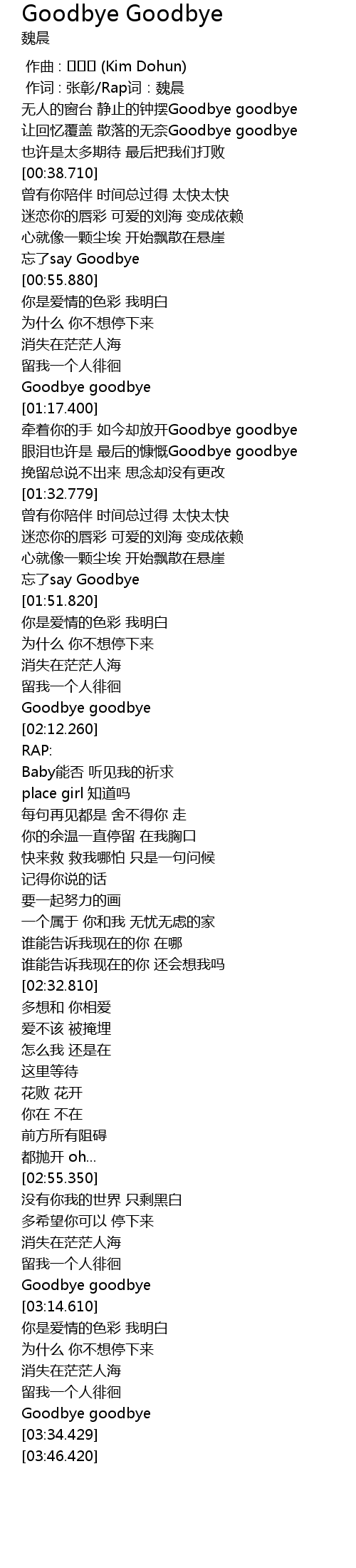 | [00:24.140] | wu ren de chuang tai jing zhi de zhong bai Goodbye goodbye |