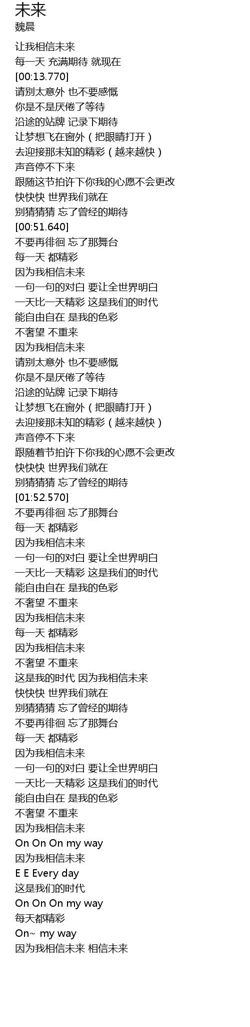 | [02:53.750] | yīn wèi wǒ xiāng xìn wèi lái |