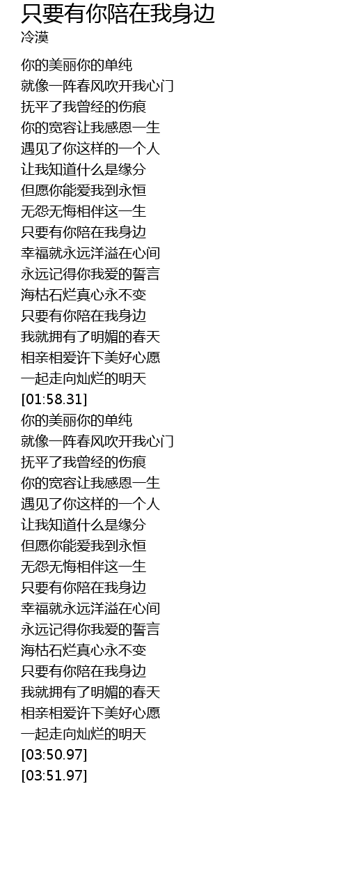 | [01:35.42] | zhǐ yào yǒu nǐ péi zài wǒ shēn biān |
