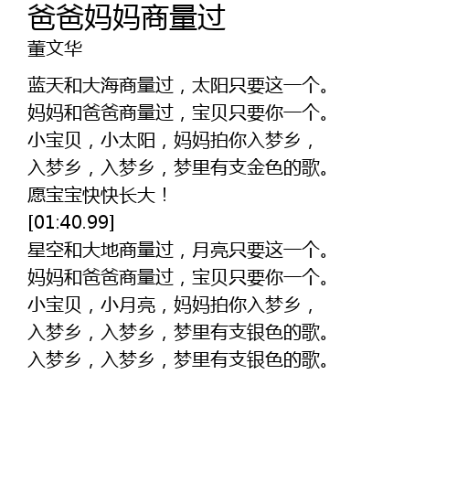 | [02:01.91] | mā mā hé bà bà shāng liáng guò, bǎo bèi zhǐ yào nǐ yí gè. |