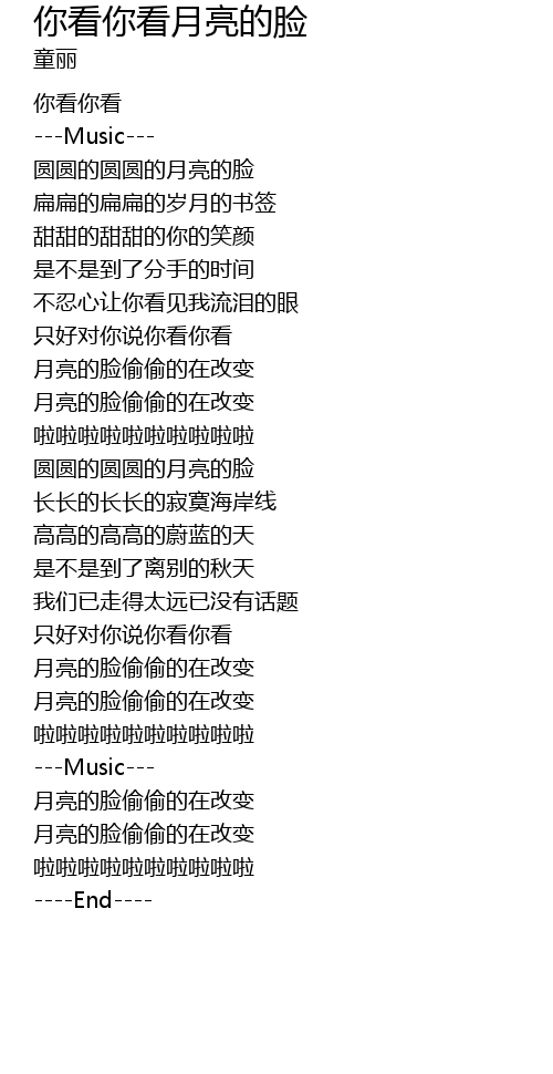 | [00:33.07] | 圆圆的圆圆的月亮的脸 |