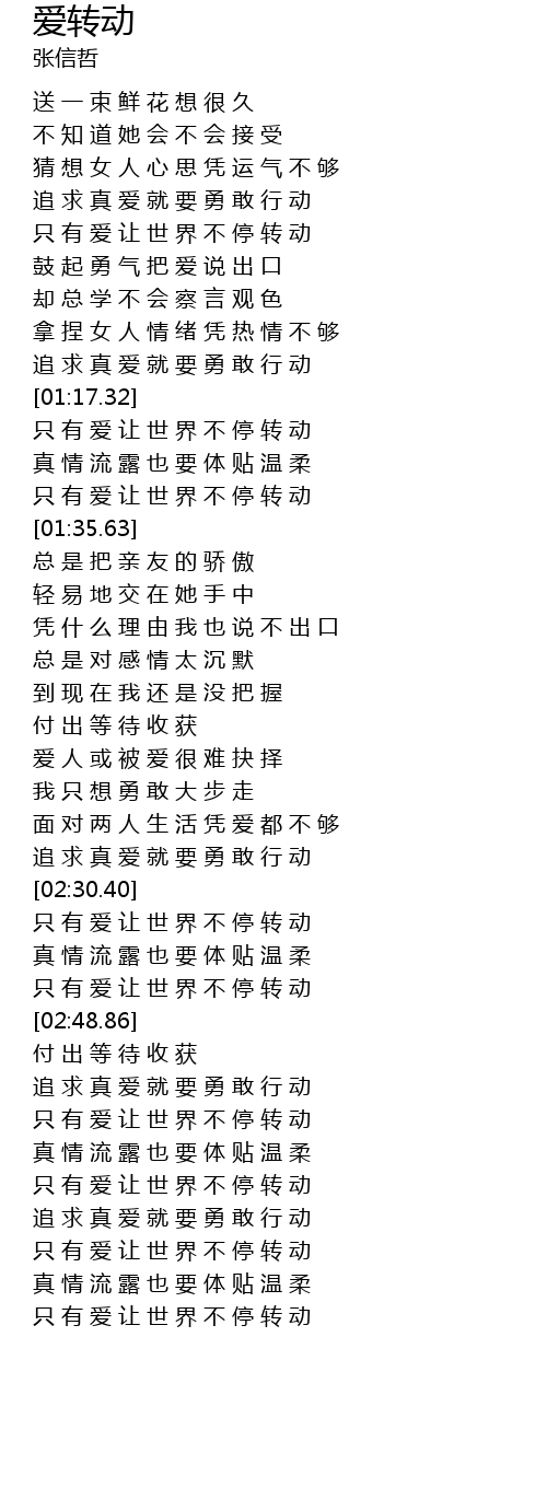 | [01:30.17] | zhi you ai rang shi jie bu ting zhuan dong |