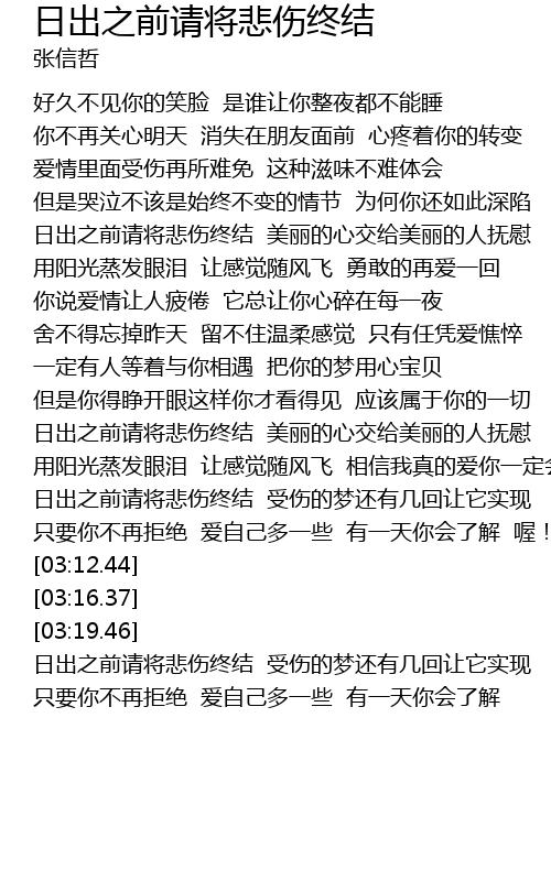 | [04:05.98] | 日出之前请将悲伤终结 受伤的梦还有几回让它实现 只要你不再拒绝 爱自己多一些 有一天你会了解 |