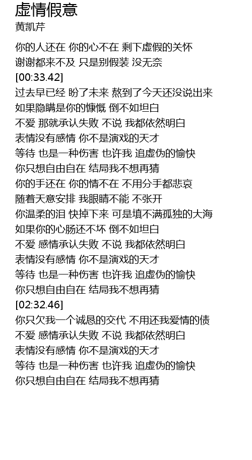 | [00:20.11] | 你的人还在 你的心不在 剩下虚假的关怀 |