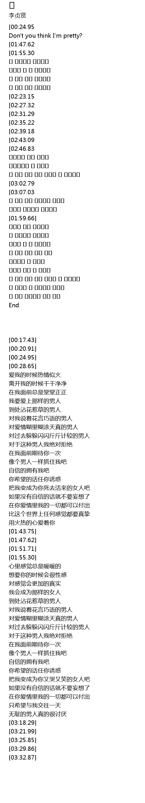 | [00:17.43][00:24.95][01:43.75][01:51.71][03:18.29][03:25.85] | I' m feel so jitty. Don' t you think I' m pretty? |
