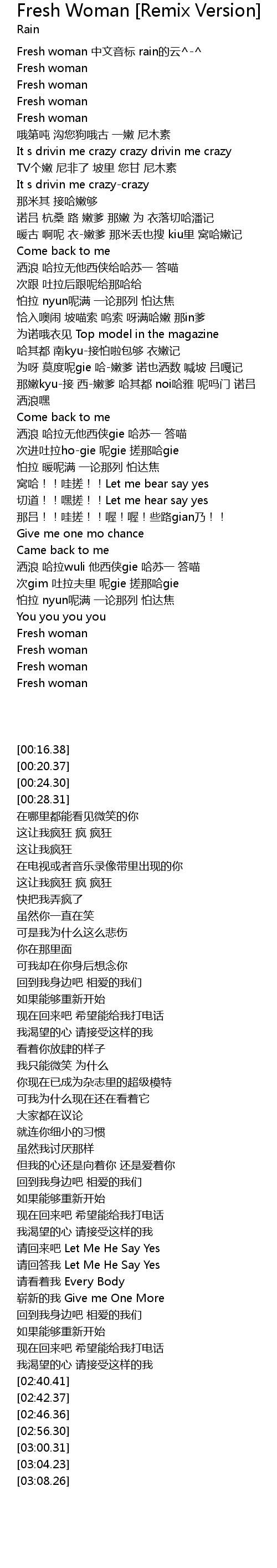 | [00:01.90] | Fresh woman 中文音标 rain的云^-^ |