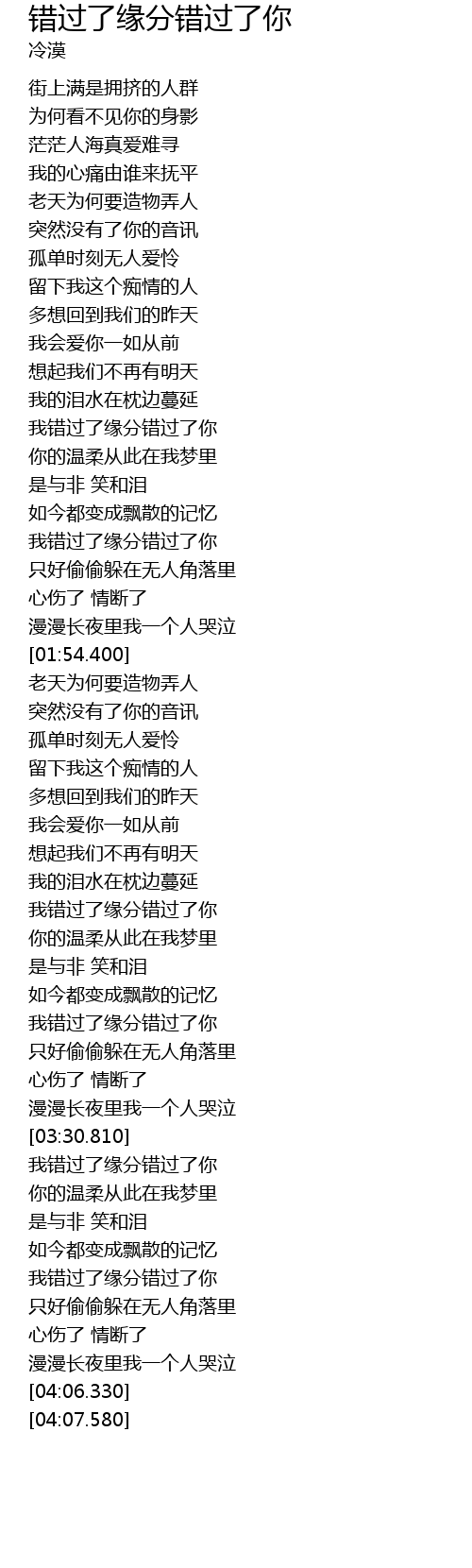| [03:48.189] | wǒ cuò guò le yuán fèn cuò guò le nǐ |