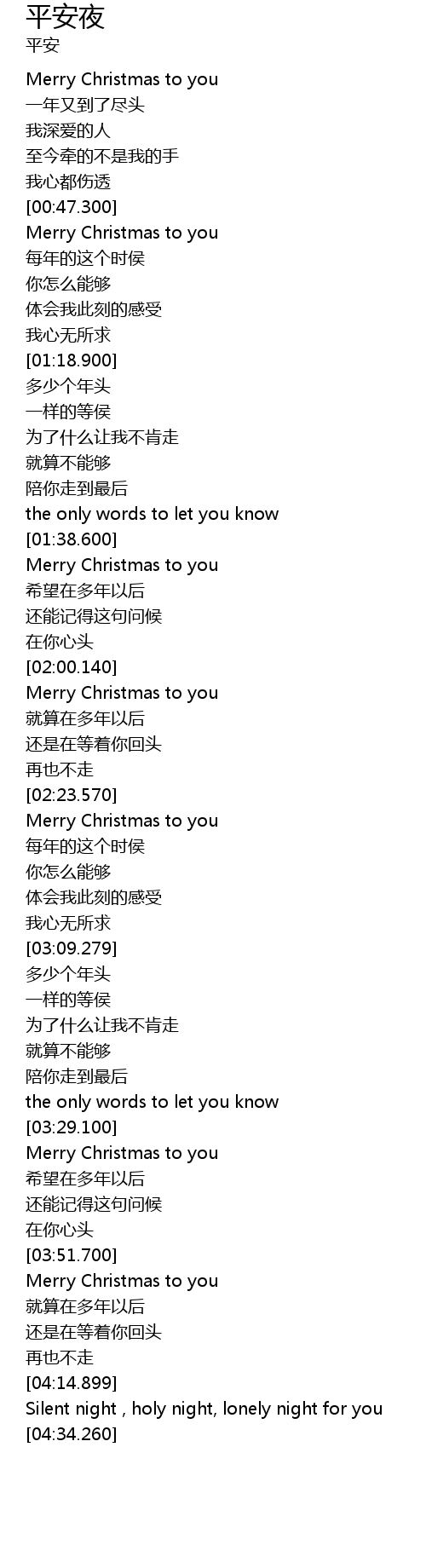 | [04:19.608] | Silent night , holy night, lonely night for you |