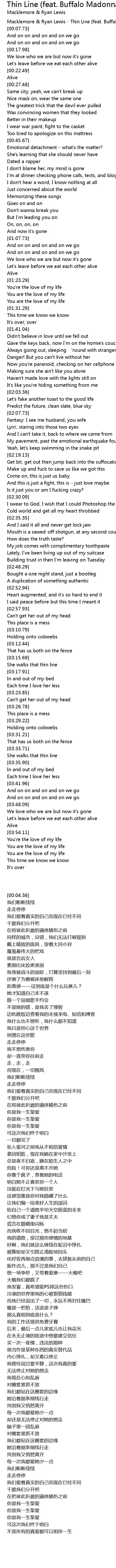 | [00:04.36]Macklemore & Ryan Lewis - Thin Line [feat. Buffalo Madonna] | |