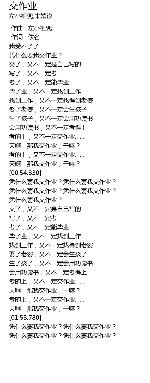 | [00:55.320] | píng shén me yào wǒ jiāo zuò yè? píng shén me yào wǒ jiāo zuò yè? |