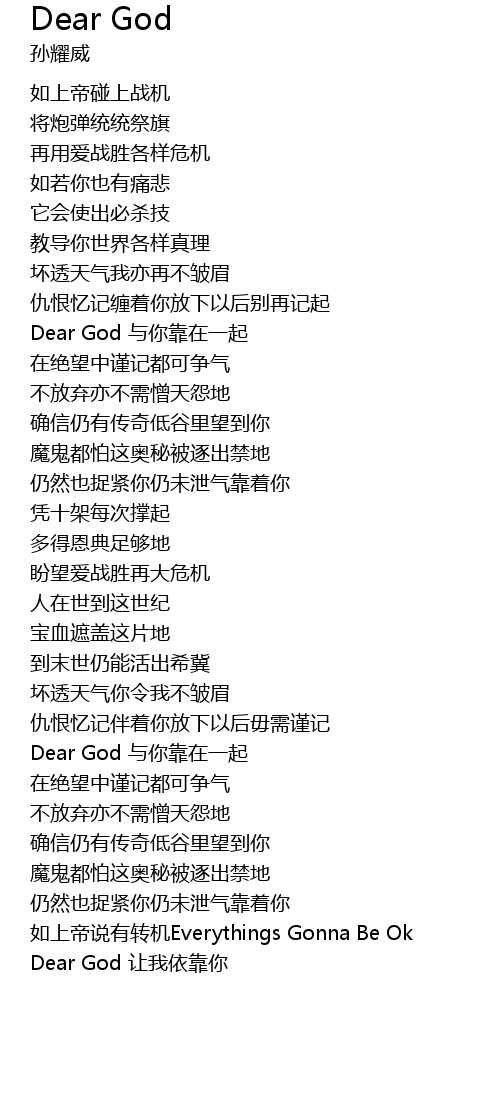 | [03:33.746] | Dear God ràng wǒ yī kào nǐ |