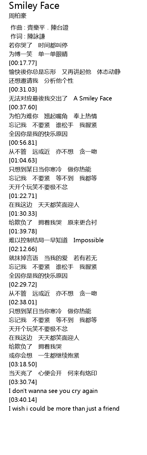 | [00:33.39] | wu fa dui ying zui hou wo jiao chu le A Smiley Face |