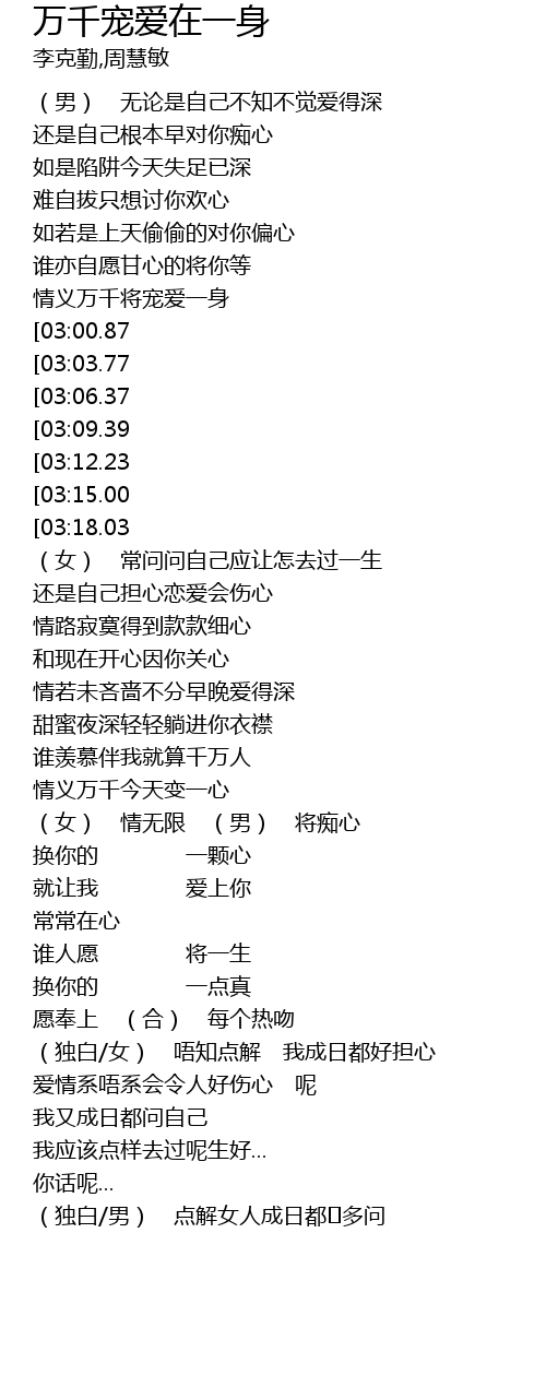 | [03:23.44][03:00.87][00:56.70] | (男) 情无限 (女) 将痴心 |