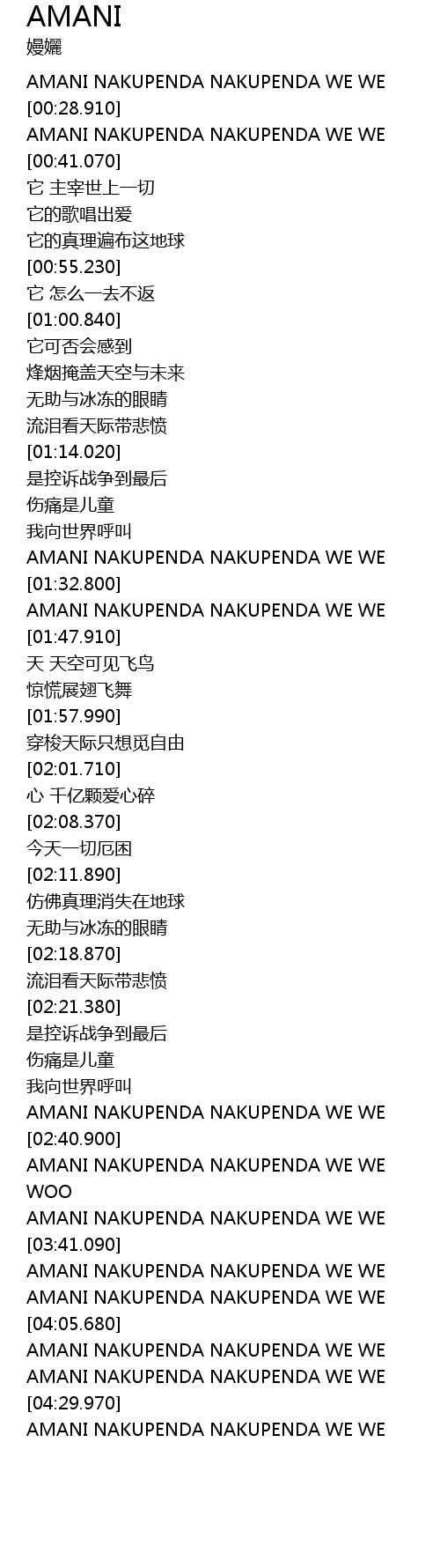 | [04:31.280] | AMANI NAKUPENDA NAKUPENDA WE WE |