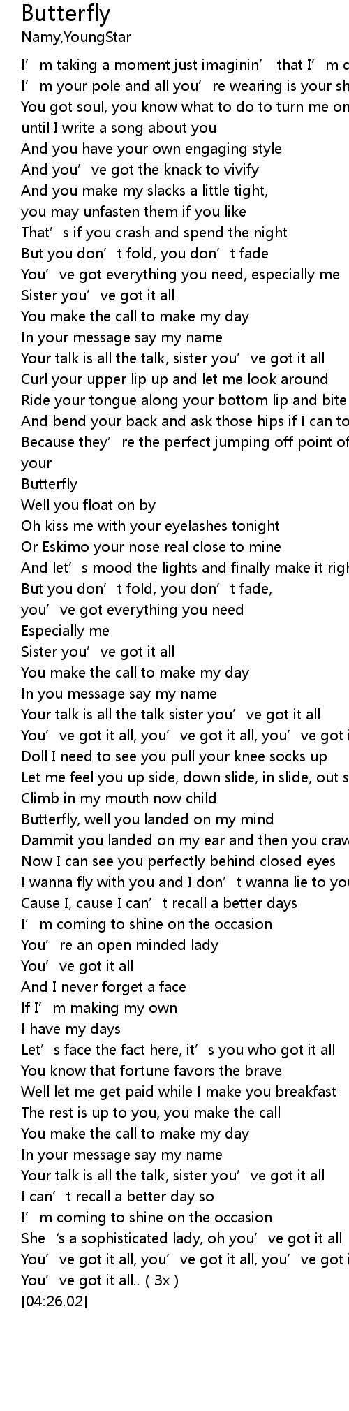 | [03:15.26] | Butterfly, well you landed on my mind |
