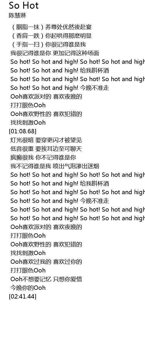 | [00:42.67] | So hot! So hot and high! So hot! So hot and high! |
