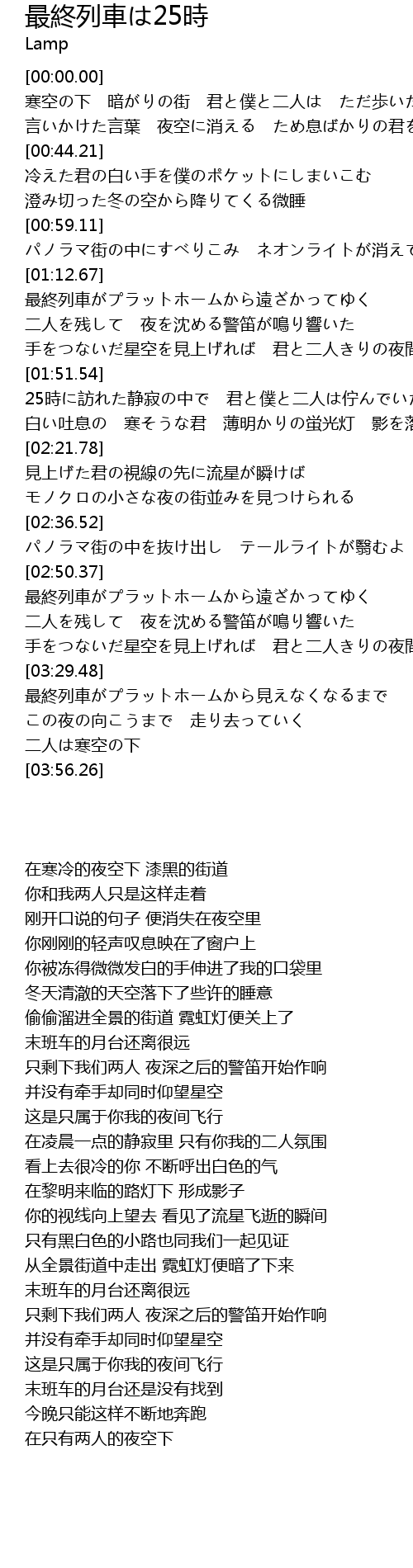 | [01:53.38] | 25時に訪れた静寂の中で 君と僕と二人は佇んでいた |