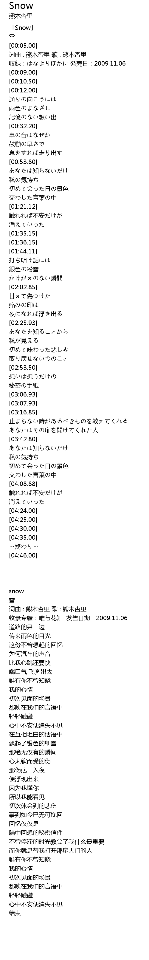 | [00:06.00] | 词曲∶熊木杏里 歌∶熊木杏里 |