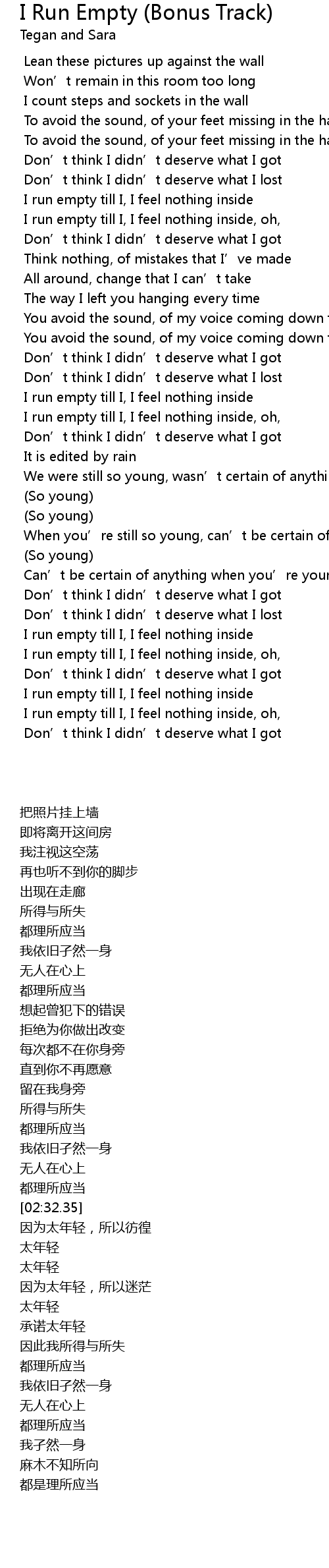 | [02:16.59] | I run empty till I, I feel nothing inside |