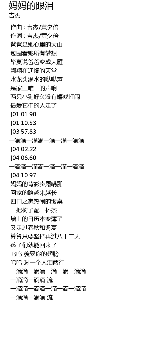 | [04:19.82] [04:02.22] [03:44.57] [01:23.68] | 一滴滴一滴滴 流 |