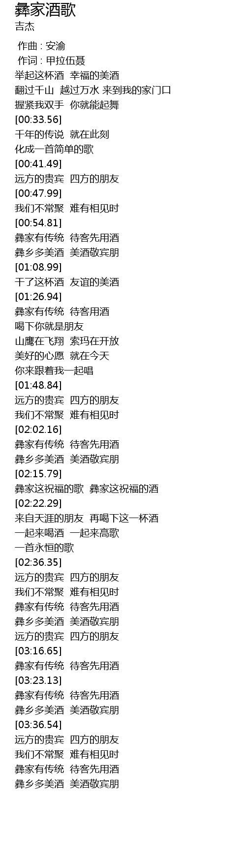 | [03:30.48] | 彝乡多美酒 美酒敬宾朋 |