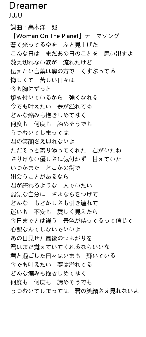 | [01:09.95] | 今でも叶えたい 夢が溢れてる |