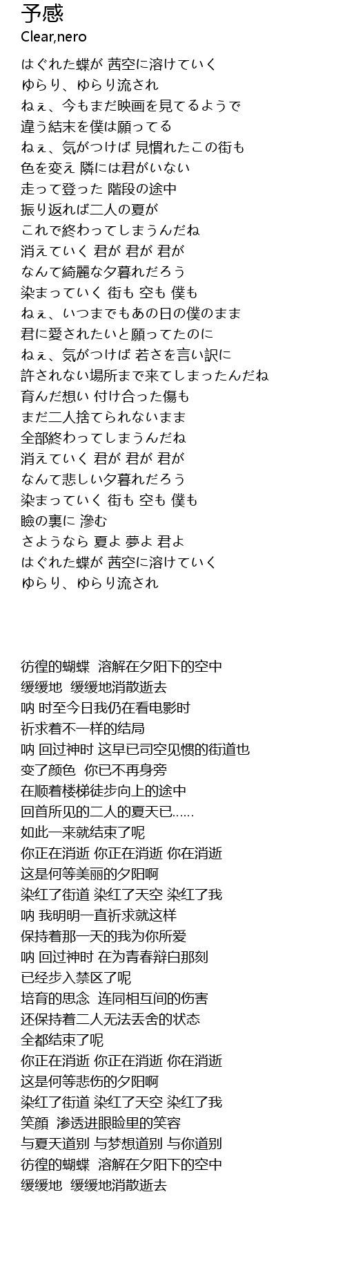 | [03:57.97] | はぐれた蝶が 茜空に溶けていく |