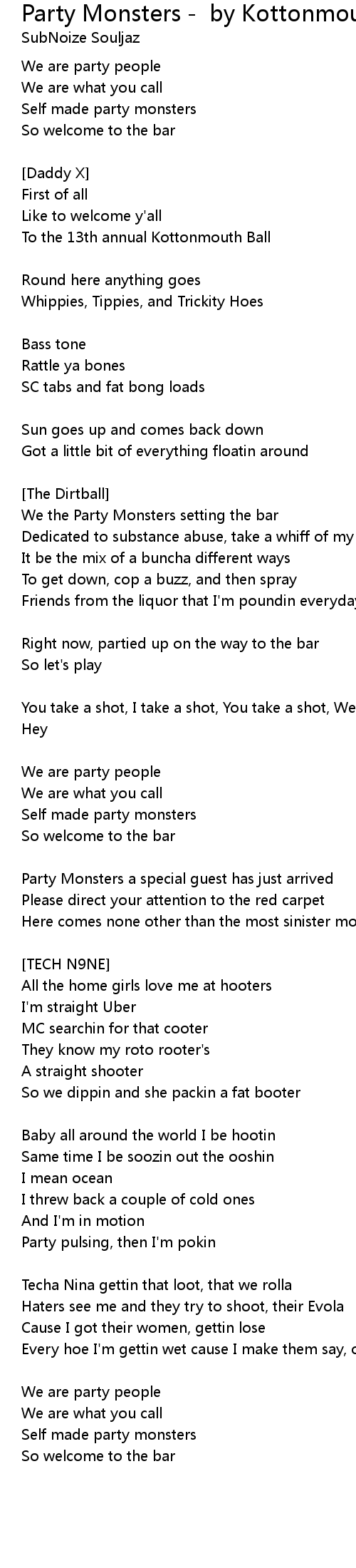Party Monsters -  by Kottonmouth Kings & Tech N9ne Party Monsters    by Kottonmouth Kings  Tech N9ne Lyrics