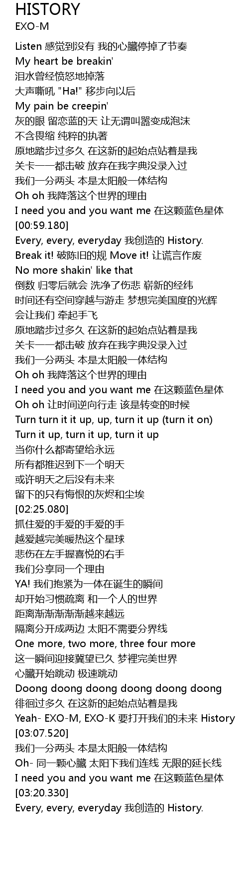 | [03:04.330] | Yeah- EXO-M, EXO-K 要打开我们的未来 History |