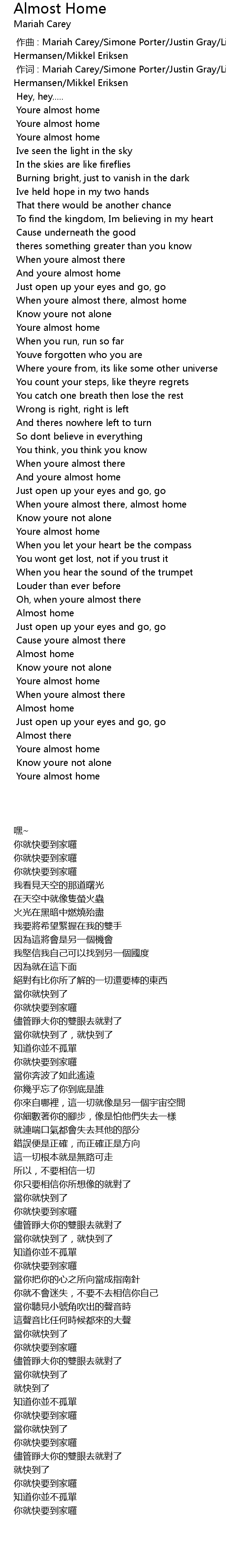 | [00:00.363] | zuo ci : Mariah Carey Simone Porter Justin Gray Lindsey Ray Tor Erik Hermansen Mikkel Eriksen |