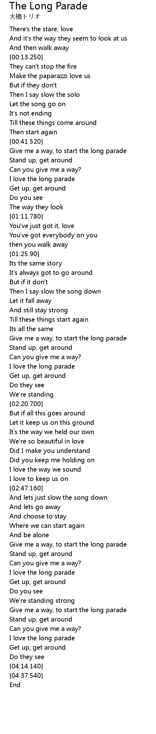 | [03:48.400] | Give me a way, to start the long parade |
