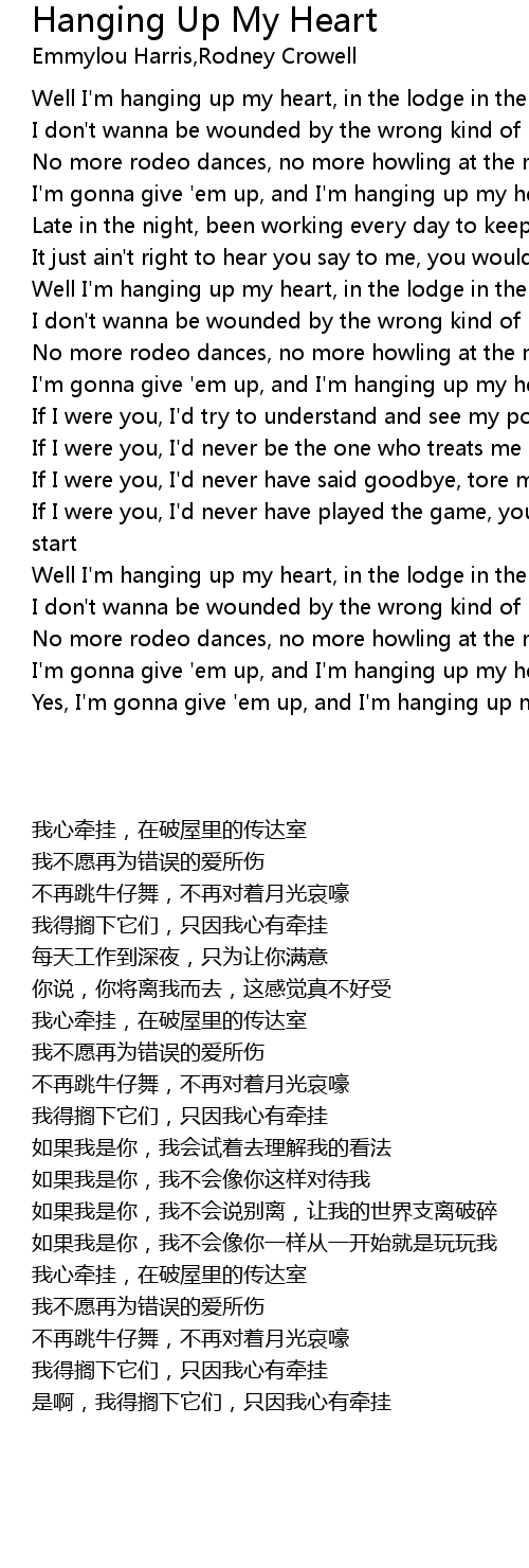 I'm gonna give 'em up, and I'm hanging up my heart. |