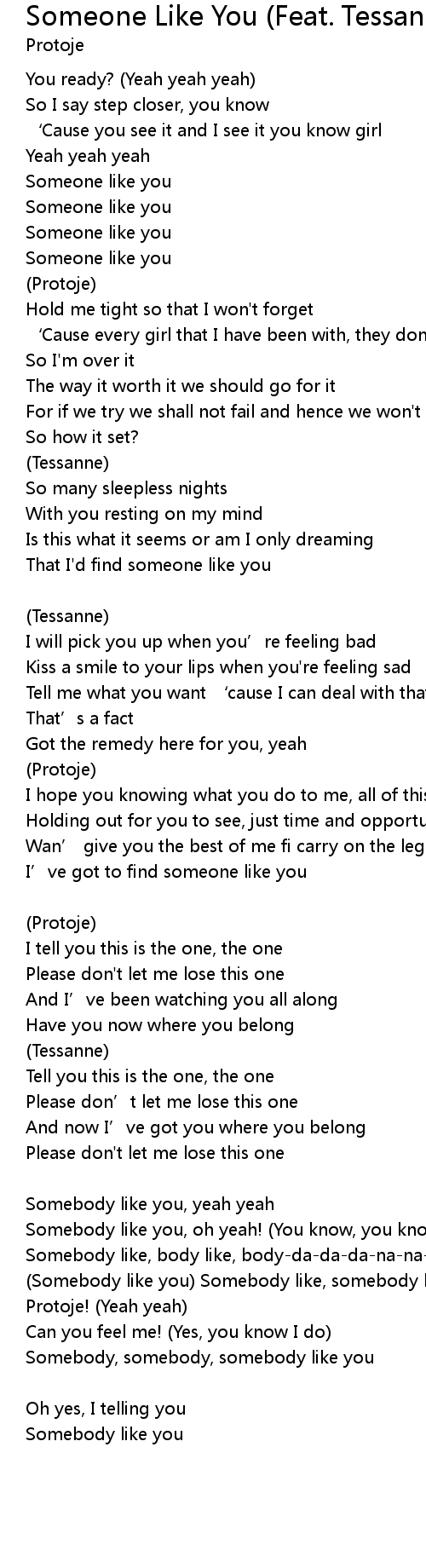 | Somebody like, body like, bodydadadanananana yeah yeah yeah | |