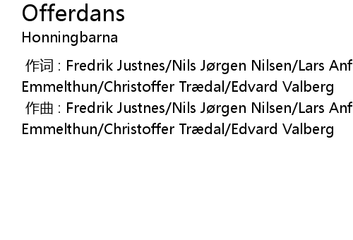| [00:00.000] | 作词 : Fredrik Justnes/Nils Jørgen Nilsen/Lars Anfrido Emmelthun/Christoffer Trædal/Edvard Valberg |