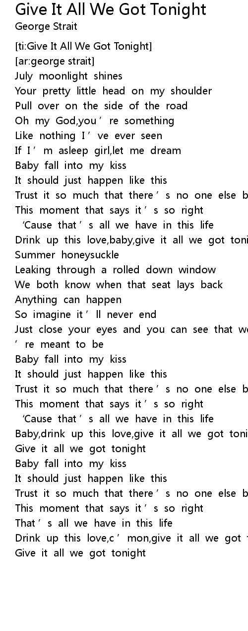 | [01:11.605] | Drink up this love, baby, give it all we got tonight |