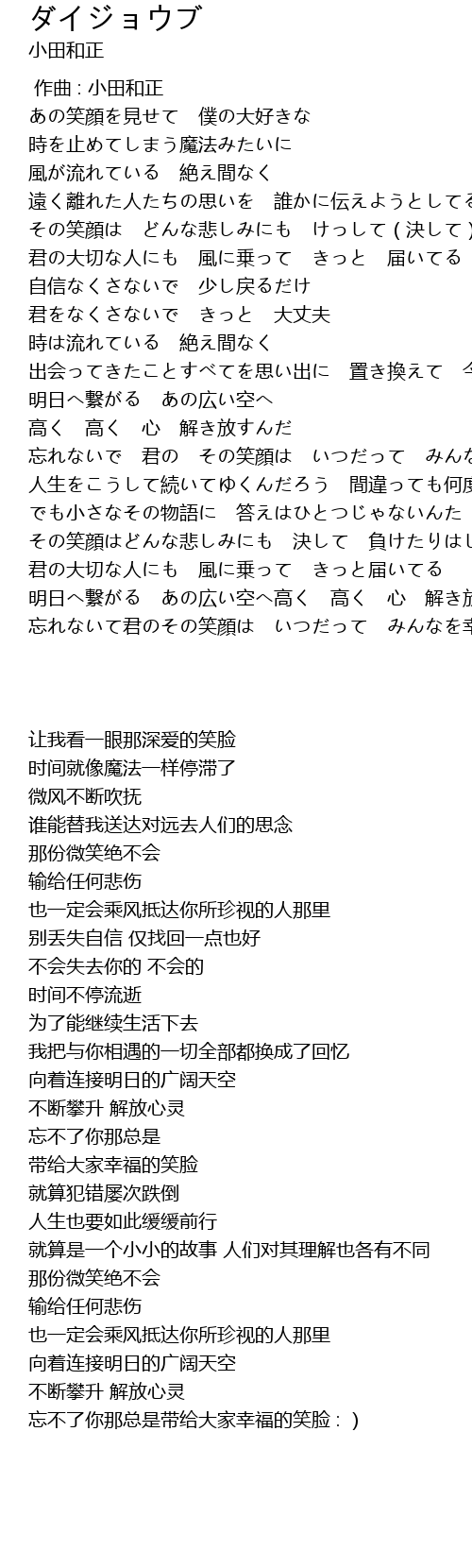 | [03:26.60] | 忘れないて君のその笑顔は いつだって みんなを幸せにしている |