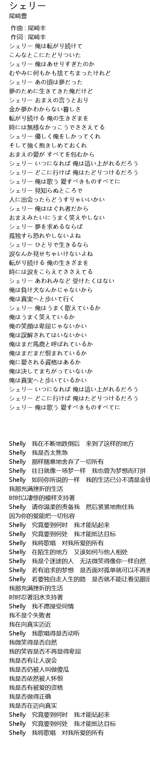 | [00:38.06] | シェリー あの頃は夢だった 夢のために生きてきた俺だけど |