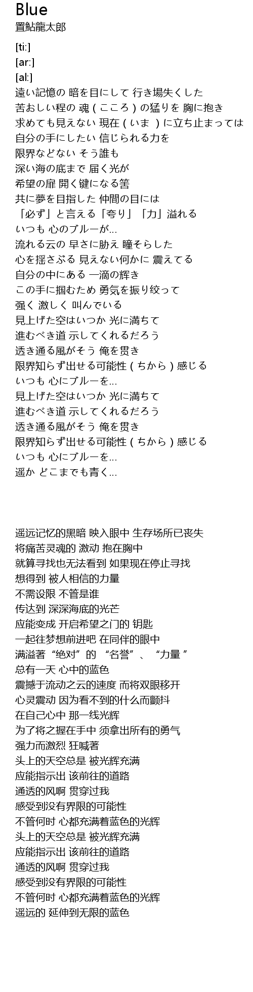 | [03:56.49] | 遥か どこまでも青く… |