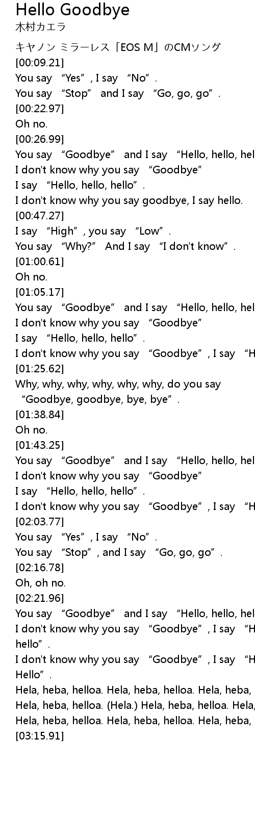 | [02:37.02] | I don't know why you say “Goodbye”, I say “Hello-wow, oh. Hello”. |