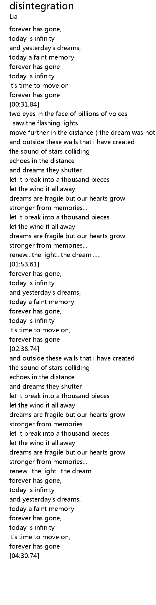 | [00:51.26] | move further in the distance(the dream was not meant to be) |