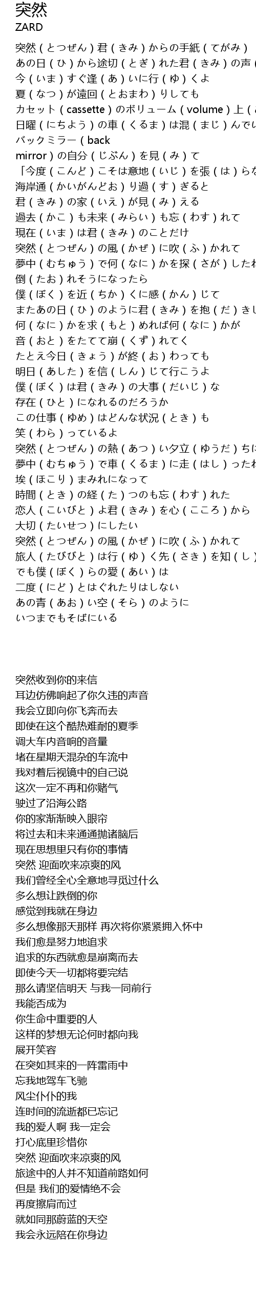 | [00:01.080] | 突然(とつぜん)君(きみ)からの手紙(てがみ) |