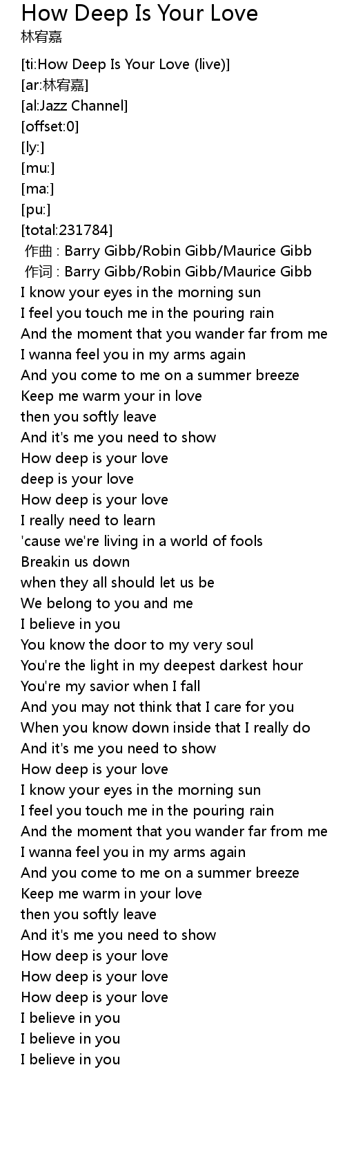 | [00:00.00] | 作曲 : Barry Gibb/Robin Gibb/Maurice Gibb |